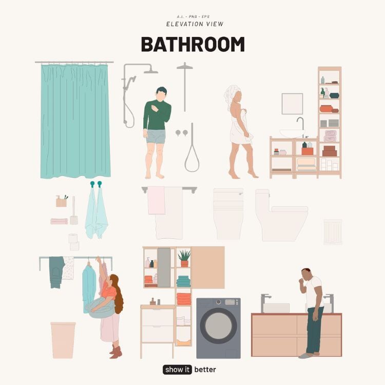 This pack contains 21 items of bathroom furniture, that are in an elevation view. Also, each has a line format and a colored format. They are compatible with many graphic software.