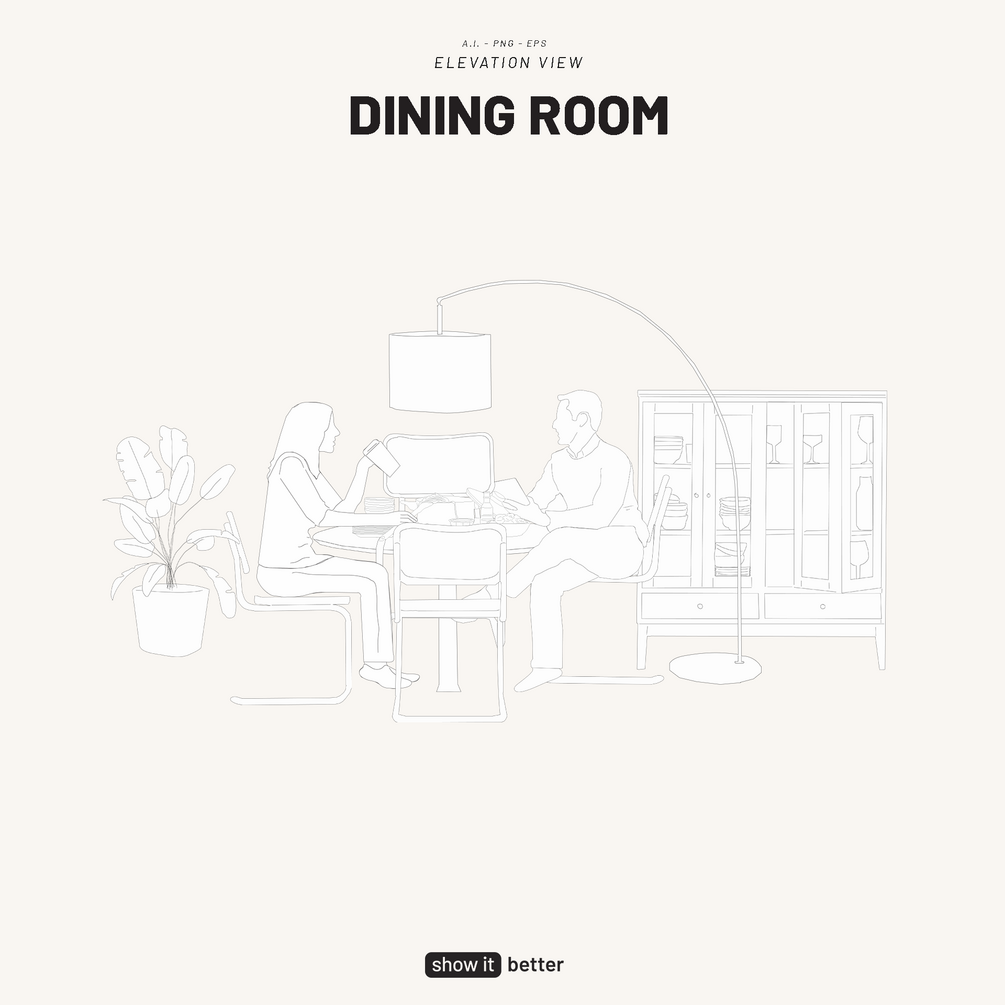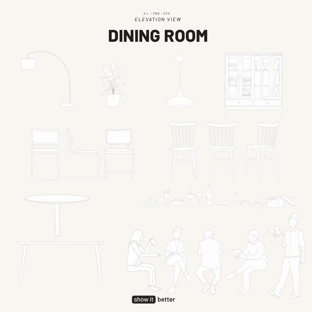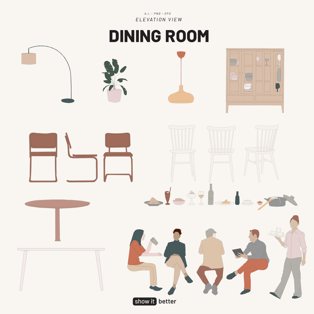 In this pack, you will get 27 elevation view illustrations that are made for a dining set!