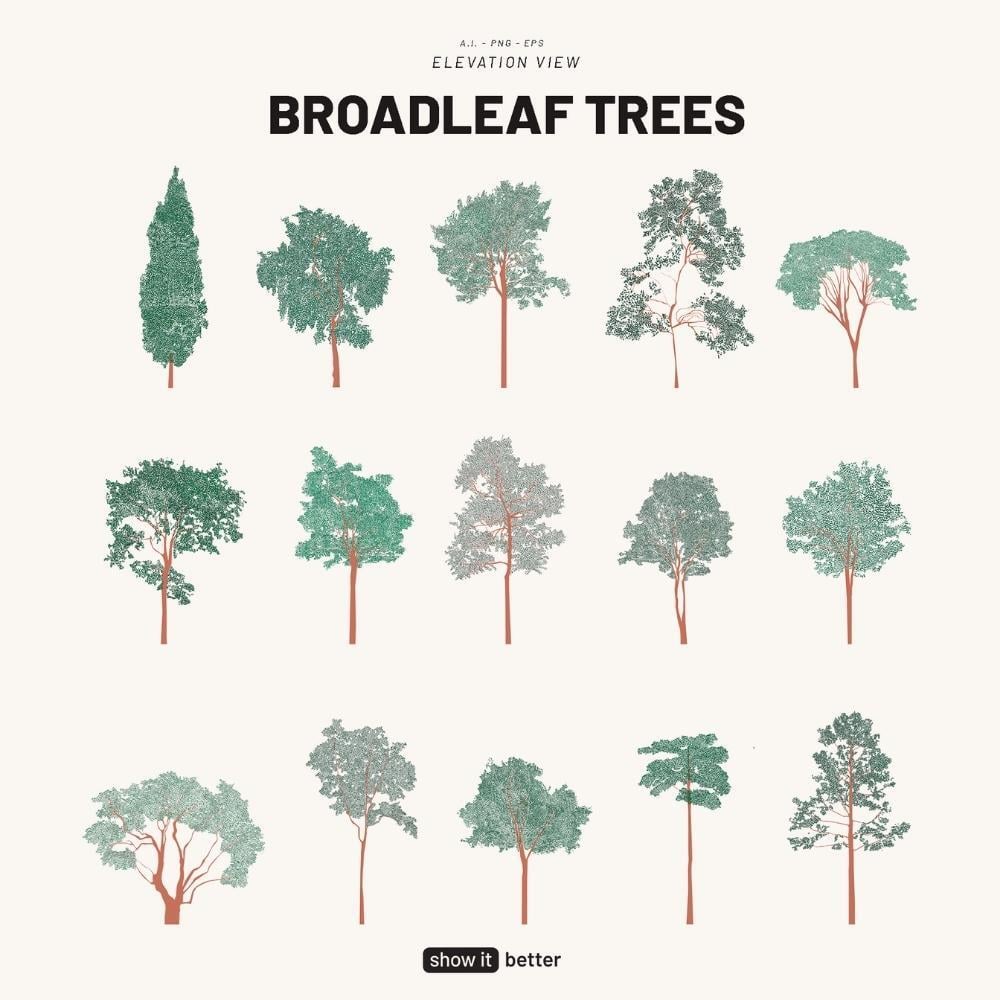 This pack contains 15 broadleaf tree elevation drawings in high detail.  Also, each has a line format and a colored format. They are compatible with many graphic software.