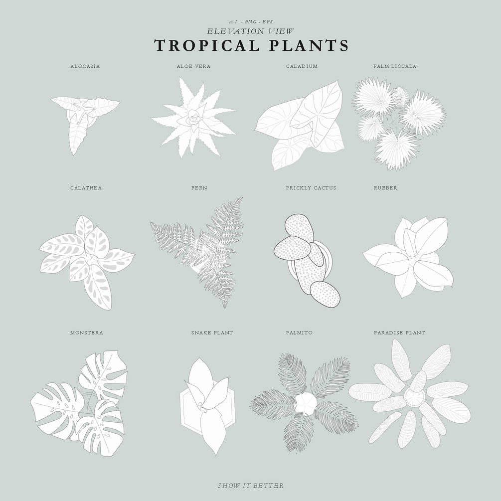 24 Illustrated plants. 12 in Elevation and 12 in Top View. Each plant has a colored an line variation.