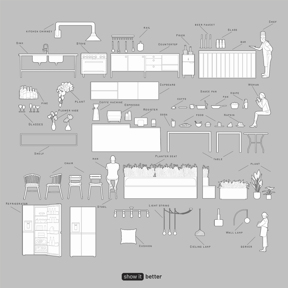 Elevate your architectural designs with the sophisticated elegance of our newest addition, the Restaurant Minimal Elevation pack. This exclusive collection boasts 71 diverse elements, meticulously designed to enrich your elevation restaurant scenes. From stylish tables and chairs to modern kitchen appliances and decorative plants, each piece embodies a minimalist aesthetic, ensuring your projects capture the essence of contemporary dining spaces.
