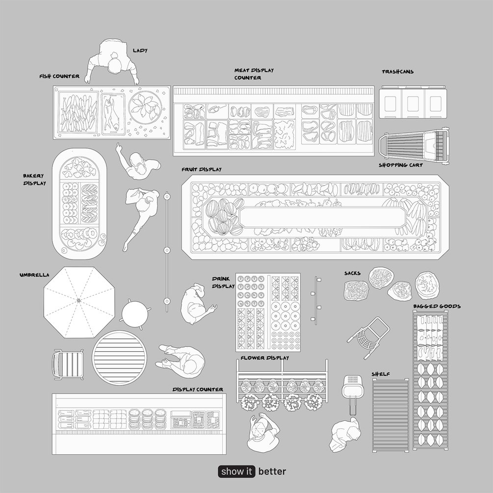 Introducing the Food Market Top View Pack by Show it Better — a meticulously crafted set of 32 unique top-view elements designed to bring life, vibrancy, and realism to architectural plans, diagrams, and urban illustrations. Perfect for showcasing commercial zones, public markets, or community spaces, this collection offers everything you need to create a dynamic food market scene from above.