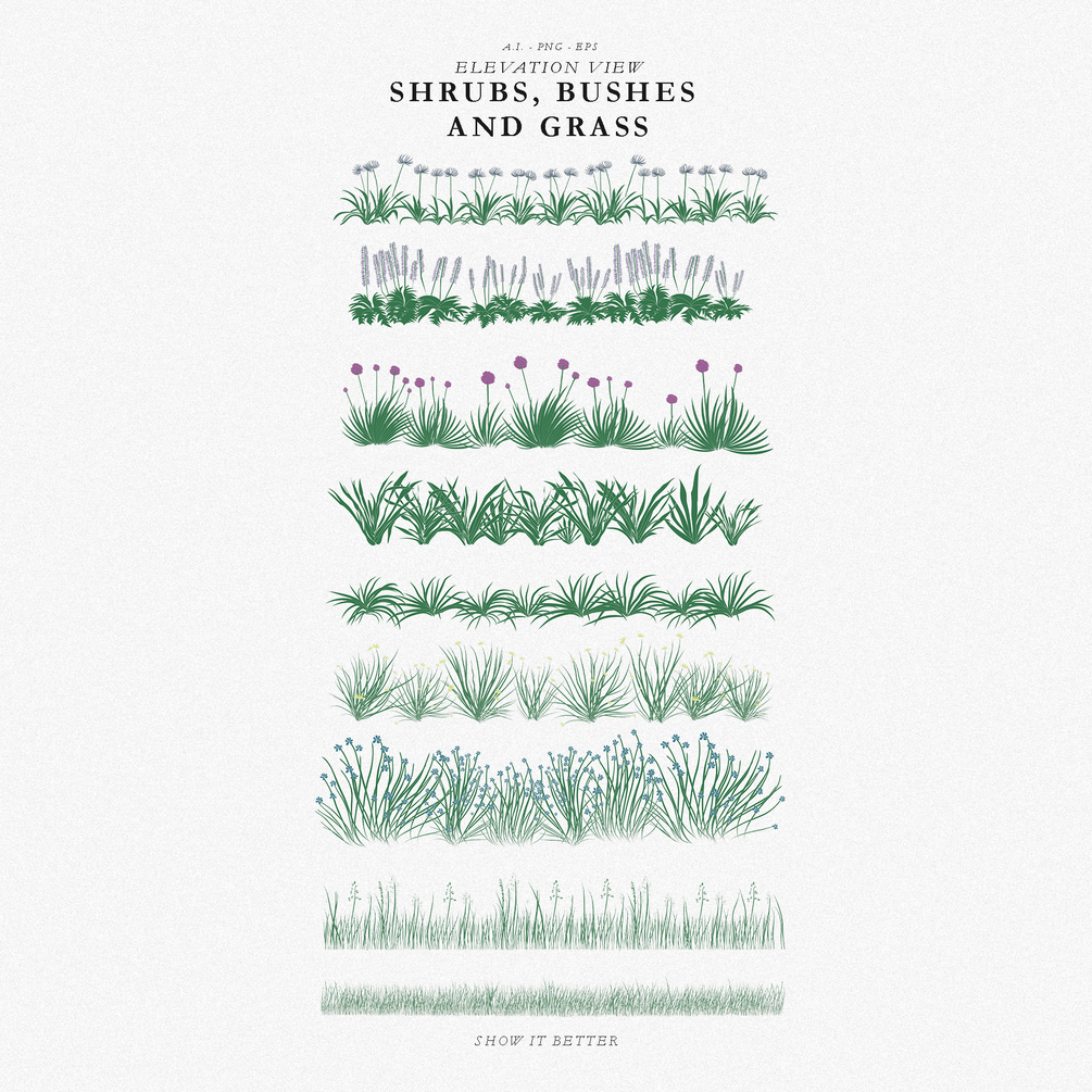 In this pack, you will get 15 vegetation illustrations that are in the category of Bushes, shrubs, and grass in elevation view. In total 15 elements come in two versions, a colored version, and a line-only version.