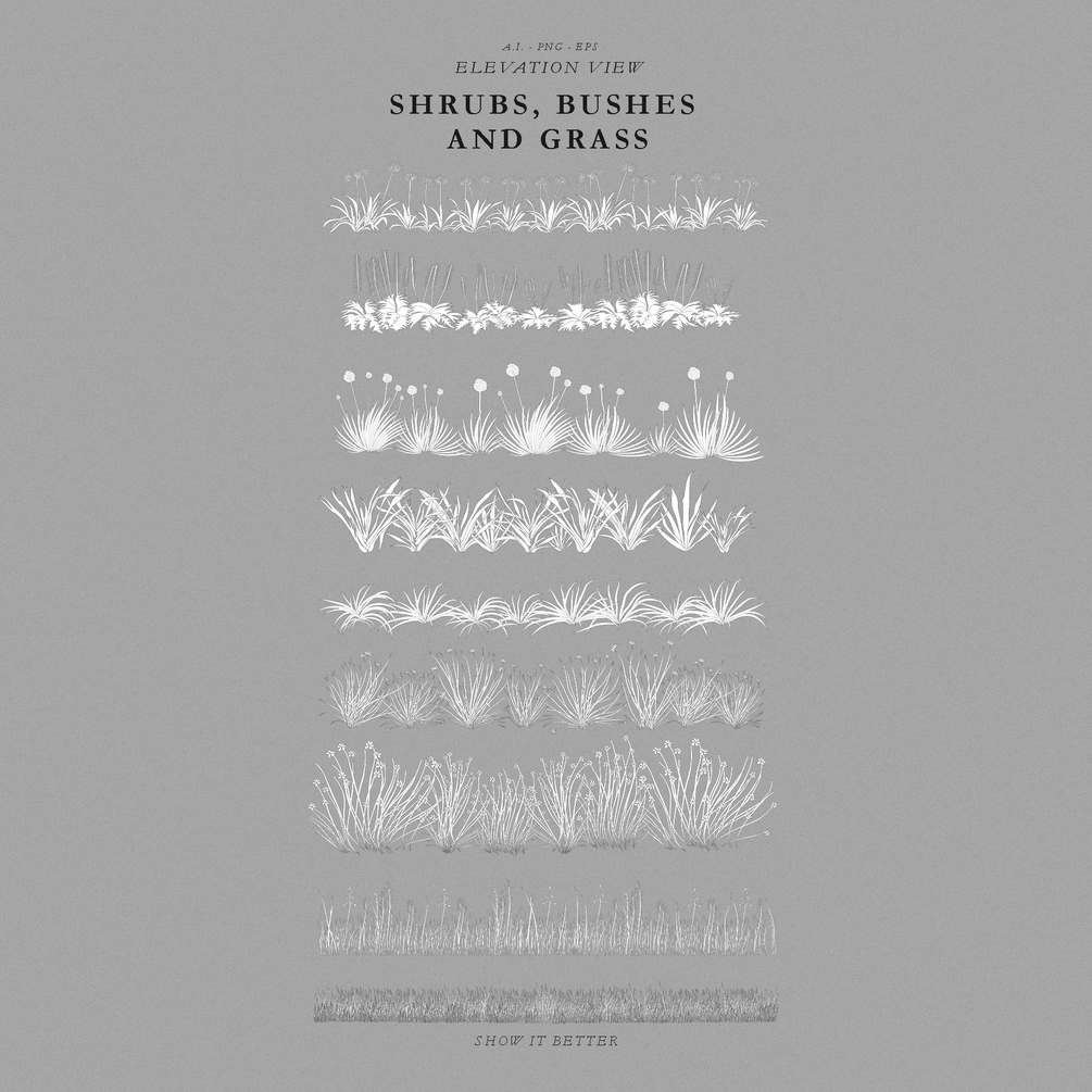In this pack, you will get 15 vegetation illustrations that are in the category of Bushes, shrubs, and grass in elevation view. In total 15 elements come in two versions, a colored version, and a line-only version.