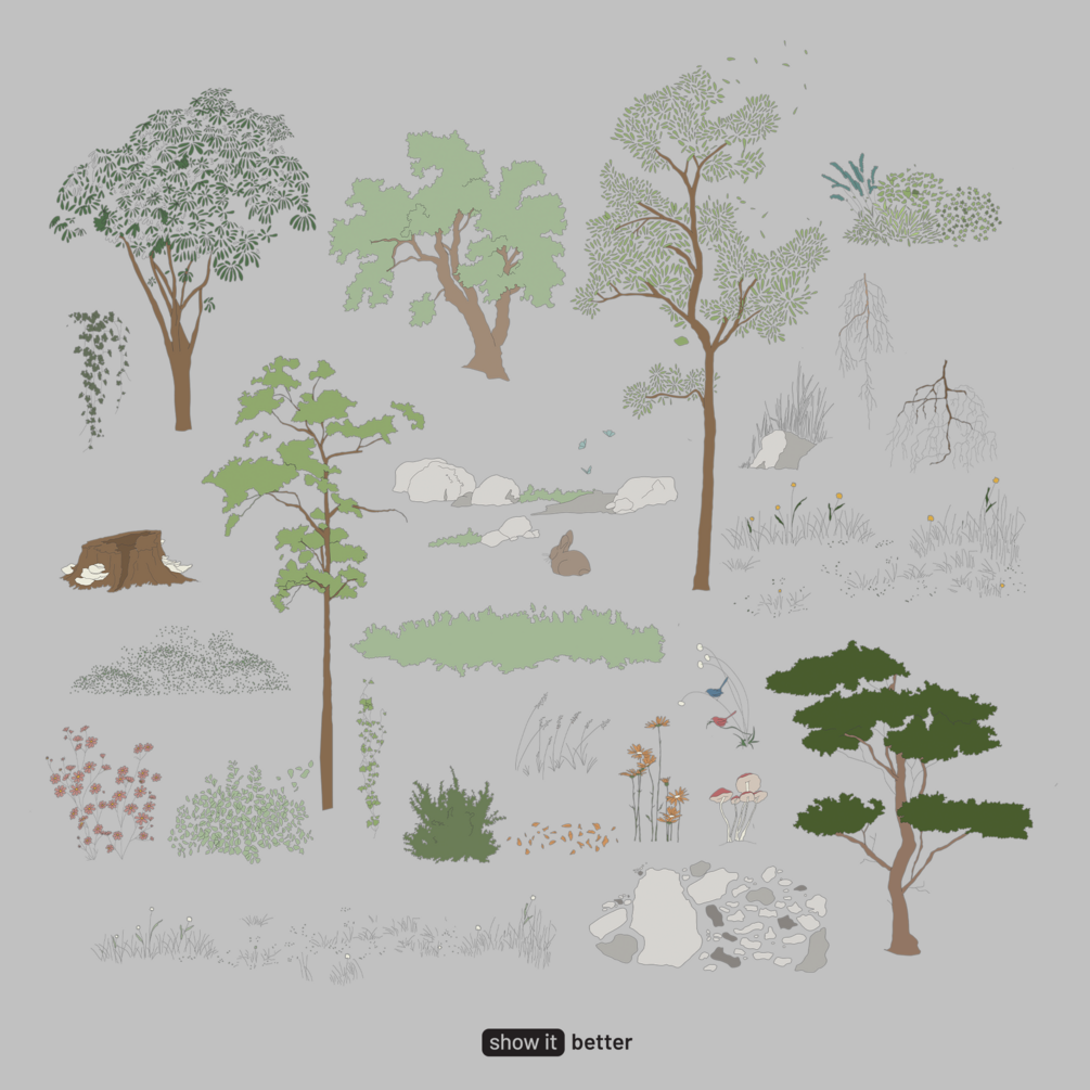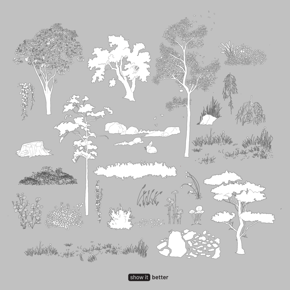 Introducing the Landscaping Elements Elevation View pack by Show it Better—a versatile collection of 35 illustrated landscape components designed to elevate your architectural sections, elevations, and site perspectives. This curated set features a diverse mix of trees, bushes, ground textures, grass clumps, flower beds, rocks, stumps, vines, and even subtle wildlife—all crafted in both clean linework and full-color versions for flexible use across different drawing styles.