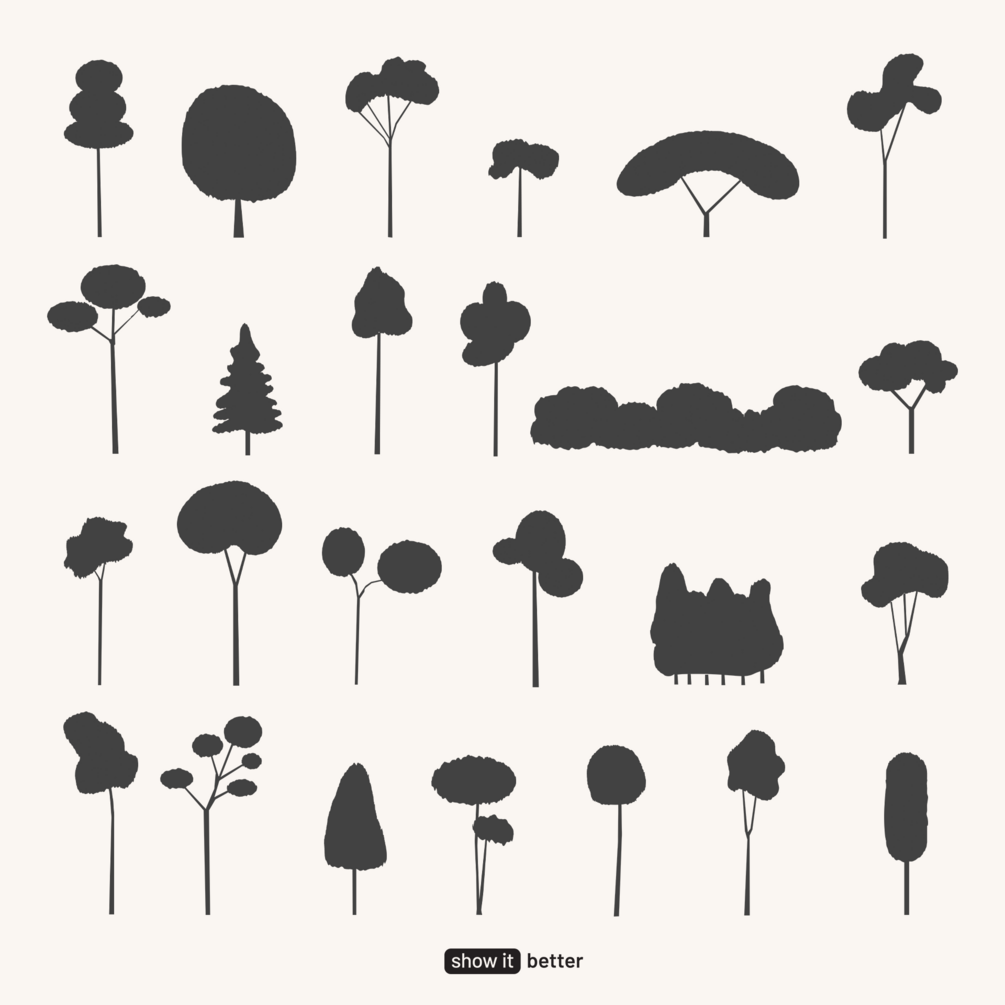 A set of 25 sketchy, conceptual trees for architectural drawings, available in multiple formats including Photoshop brushes, vector files, and CAD-friendly DWG.