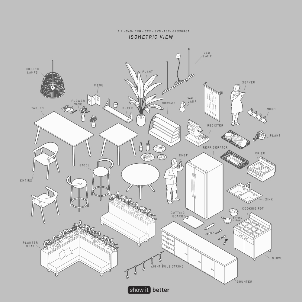Elevate your architectural designs with the sophisticated elegance of our newest addition, the Restaurant Minimal Isometric pack. This exclusive collection boasts 52 diverse elements, meticulously designed to enrich your isometric restaurant scenes. From stylish tables and chairs to modern kitchen appliances and decorative plants, each piece embodies a minimalist aesthetic, ensuring your projects capture the essence of contemporary dining spaces.