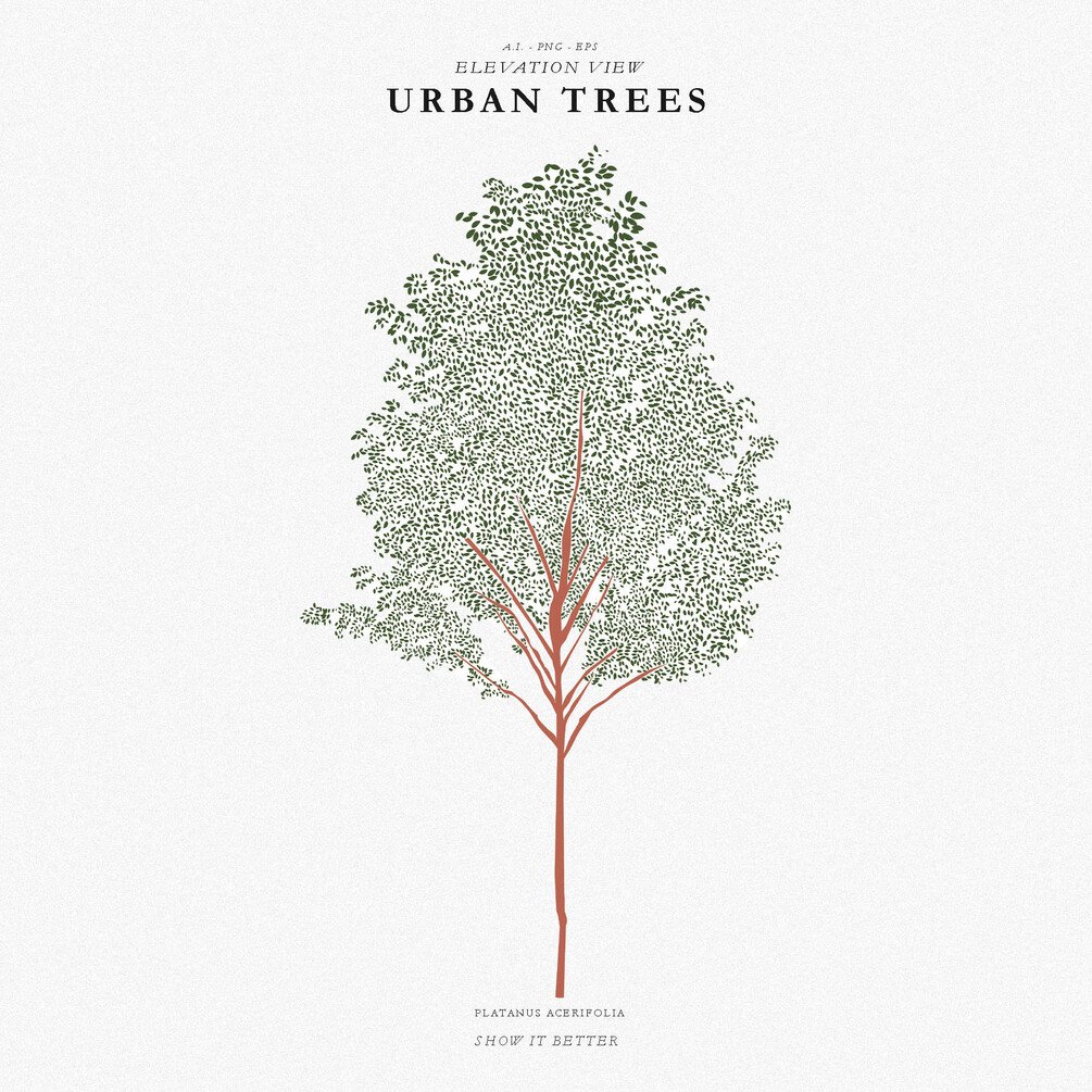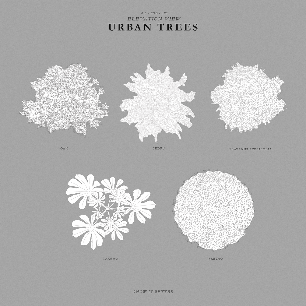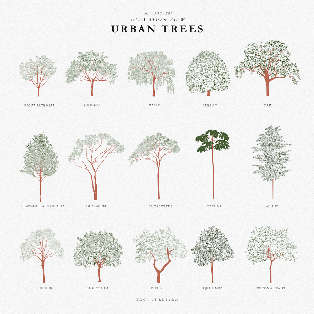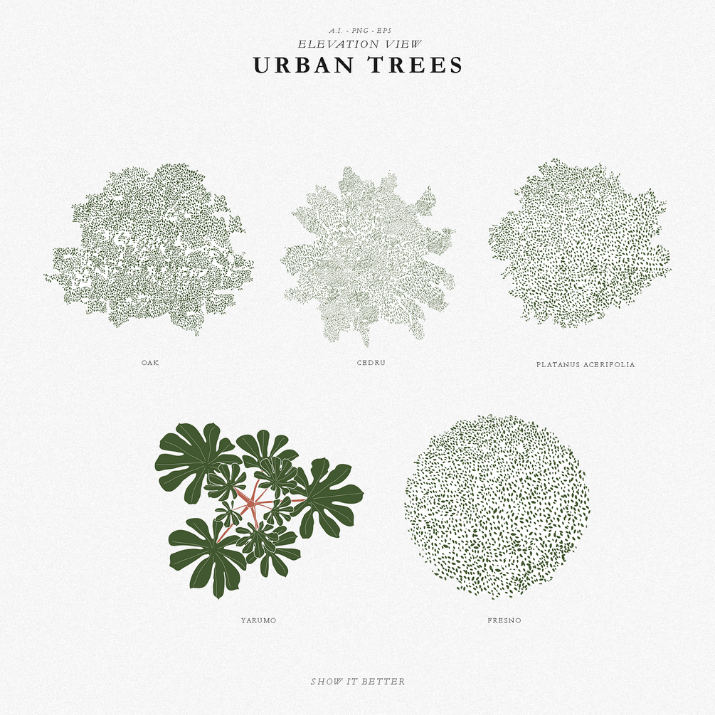 In this pack, you will get 15 urban trees in elevation view and 5 urban trees in top view. In total 20 trees come in two versions, a colored version and a line-only version.
