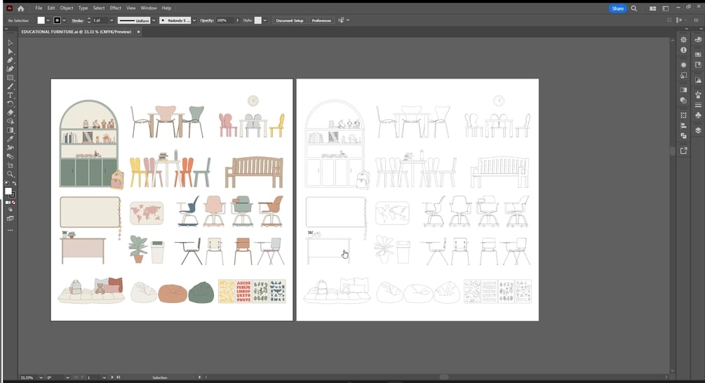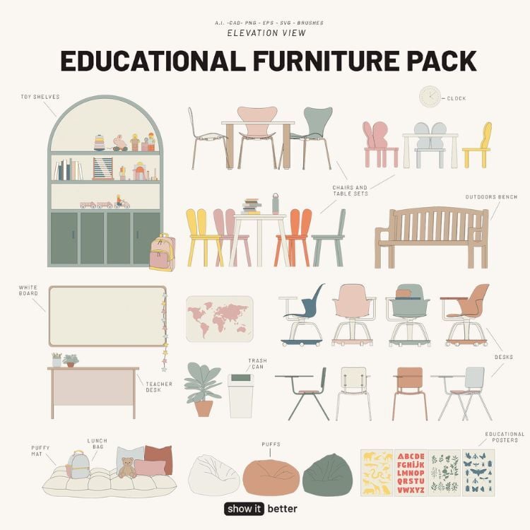 A pack of 30+ high quality elevation view educational furniture illustrations that will transform the way your drawings look. Say goodbye to boring people in your educational designs and hello to stylish and minimal pieces that will elevate your designs.
