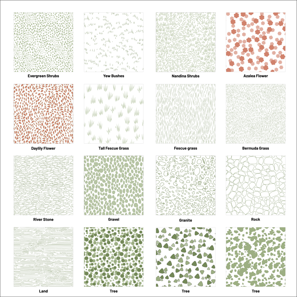 This pack includes a wide range of natural motifs such as evergreen shrubs, yew bushes, nandina shrubs, azalea flowers, daylily flowers, tall fescue grass, Bermuda grass, river stones, gravel, granite, rocks, land textures, and trees. Each pattern is carefully illustrated to capture the essence of nature, making it easy to enrich site plans, diagrams, sections, elevations, and presentation boards with a professional and polished look.