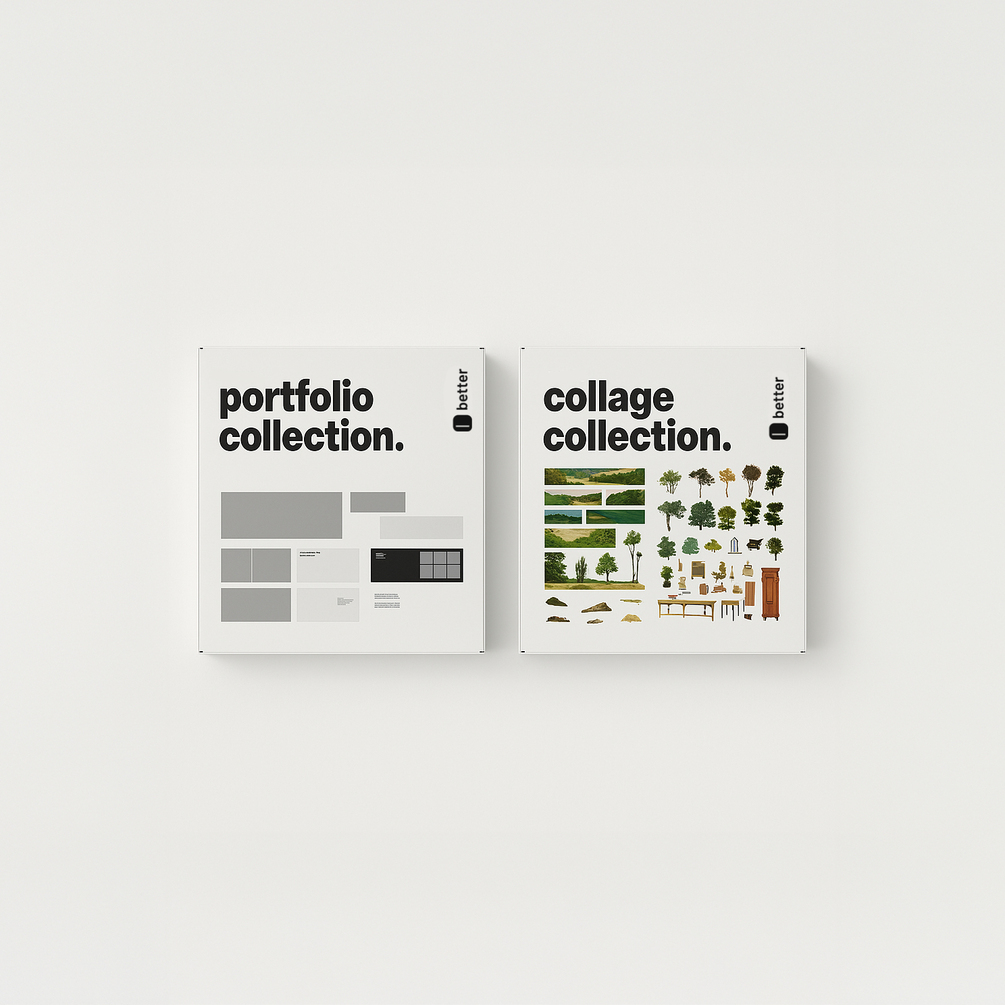 A complete bundle with our best collage assets and portfolio templates. Everything you need to create eye-catching, well-composed architectural presentations.